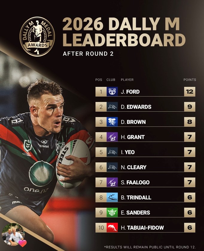 One New Zealand Warriors prop Jackson Ford, in the form of his life, has bagged his second haul of six points in two games to take the outright lead in the 2026 Dally M Medal race.