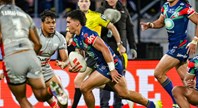 Erin Clark explodes through the middle of the ruck, breaks clear and then bumps off Dolphins fullback Hamiso Tabuai-Fidow.
